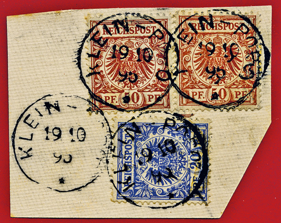19.10.1895: Vorläufer 50Pf (2x) und 20Pf (Mi.V48d & V50d) auf Briefstück mit 4x Stempel KLEIN-POPO