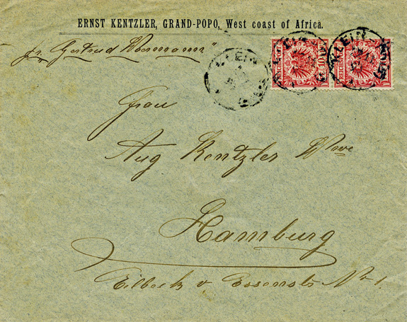 22.11.1895: schöner portogerechter Firmenbrief "Ernst Kentzler, Grand-Popo, West coast of Africa" mit Vorläufer Paar 10Pf (Mi.V47d) mit 3x Stempel KLEIN-POPO und Weiterleitungsvermerk "per Gertrud Woermann" an Frau Kentzler in HAMBURG EILBECK (23.12.95).