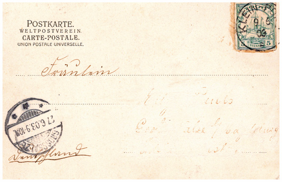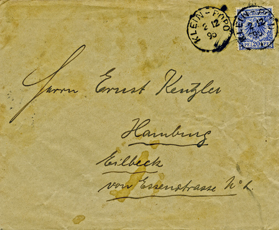 02.12.1895: portogerechter Brief mit 20Pf (Mi.V48d) und 2x Stempel KLEIN-POPO an Herrn Ernst Kentzler in HAMBURG EILBECK (08.01.96).