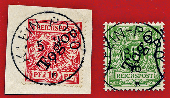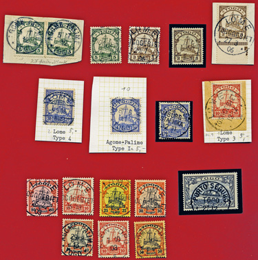 1900: hübsches Lot gebrauchter Marken (und drei Briefstücken), bestehend aus den kompletten Pfennigwerten von 3Pf bis 80Pf sowie 1x 3Mk (Mi.7 bis 15, 18), darunter eine 3Pf Marke mit dem seltenen AGBELUVHOE-Stempel.