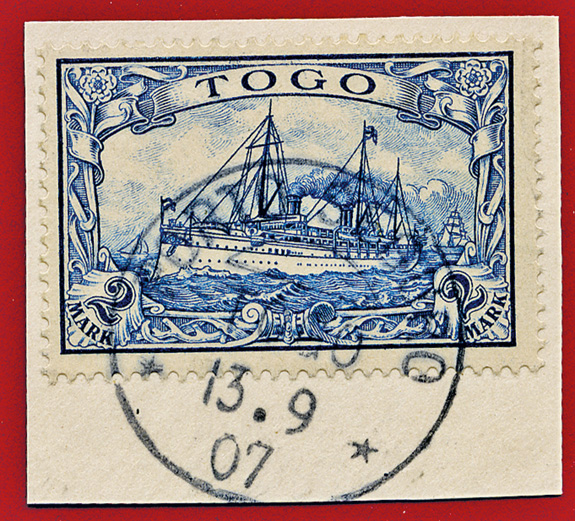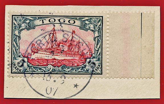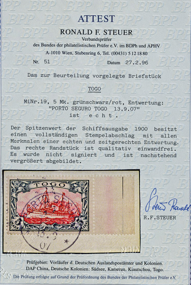 13.09.1907: 5Mk (Mi.17) auf Briefstück mit sauberem Stempel PORTO SEGURO; Attest R.Steuer - "das rechte Randstück ist qualitativ einwandfrei.".
