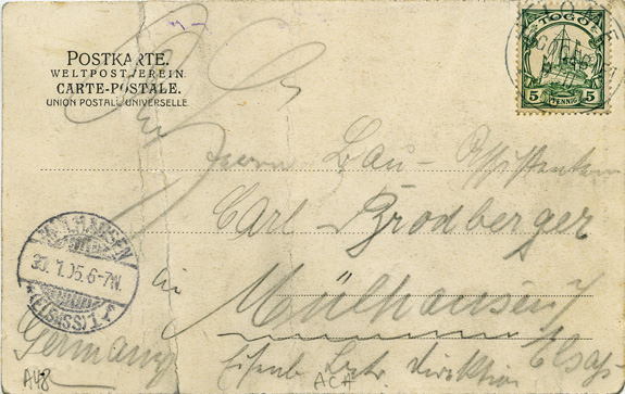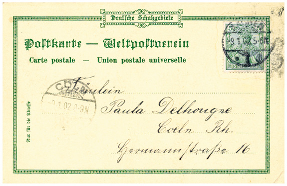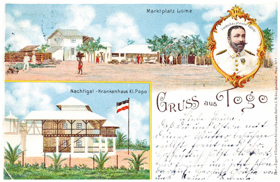 09.01.1902: gebrauchte Ansichtskarte "Gruss aus Togo (2 Motvie: Marktplatz Lome, Nachtigal-Krankenhaus Kl.Popo) - Reichsverwendung (Aachen nach Köln).