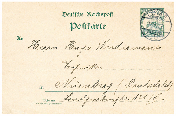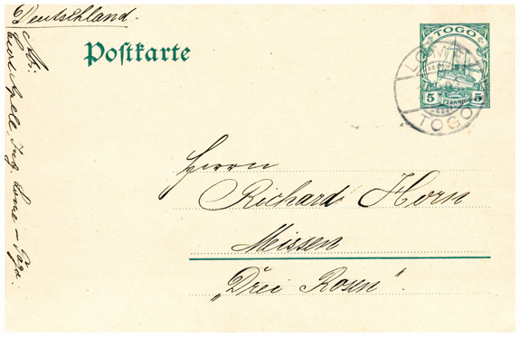 1909-1914: zwei saubere 5Pf Ganzsachenkarten (Mi.P9,16) mit Stempel LOME mit Bedarfstext nach Nürnberg bzw. Meissen.