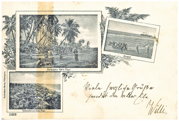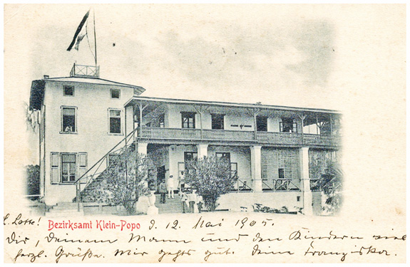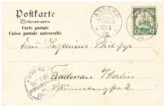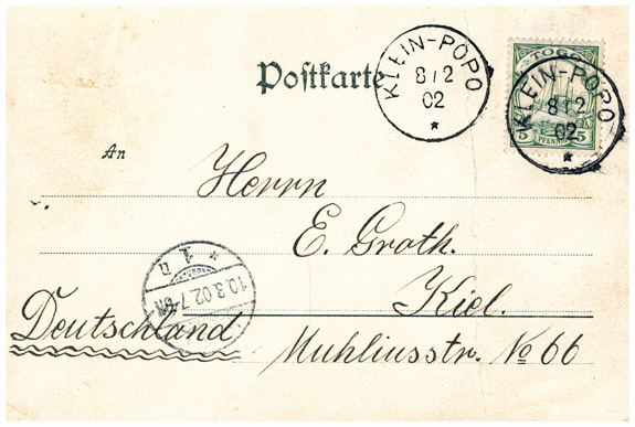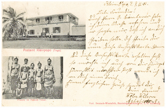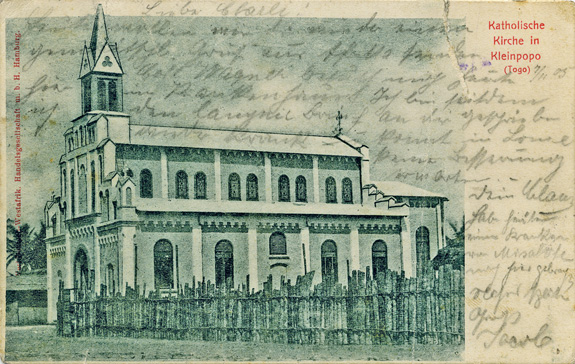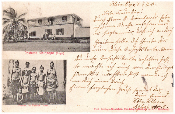 1898 - 1905: kleines Lot von 5 gebrauchten Postkarten mit Ansichten von Klein-Popo, darunter frühe Ansicht der Lagune, den Markplatz, der Katholischen Kirche, das Bezirksamt & das Postamt. Dazu 2 ungebrauchte Ansichtskarten - "Damm durch die Lagune.." & "Nachtigalkrankenhaus".
