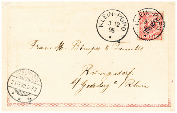 1898: 5Pf (Mi.2) mit Stempel KLEIN-POPO dazu 10Pf (Mi.3) auf Briefstück mit Stempel KLEIN-POPO.