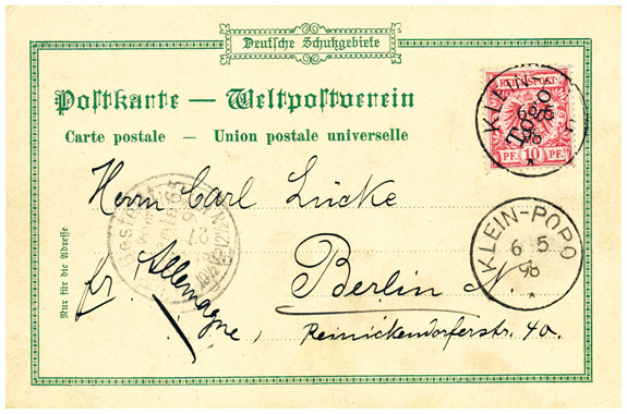 06.05.1898: Ansichtskarte "Gruss aus Dar-es-Salaam", geschrieben in "Klein-Popo 5/5.98" mit 10Pf (Mi.3) & 2x Stempel KLEIN-POPO nach BERLIN (27.5.98); Grusstext an Herr & Frau Buse.