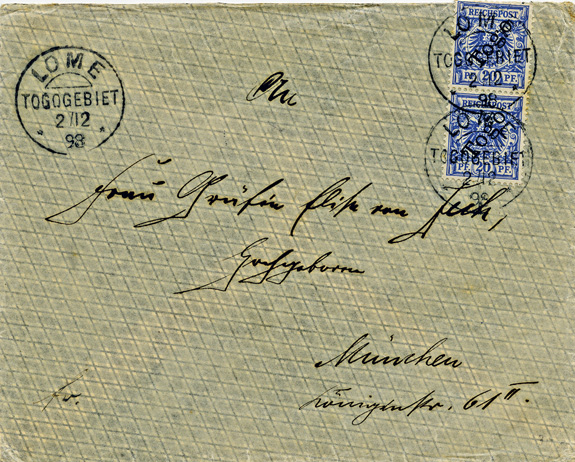 1897/1898: zwei Briefe mit 20Pf (Mi.V48d) bzw. Paar 20Pf (Mi.4) aus LOME vom Stationsleiter von Kete-Kratschi und späteren Gouverneur Julius Graf von Zech an Gräfin Elise von Zech in München.