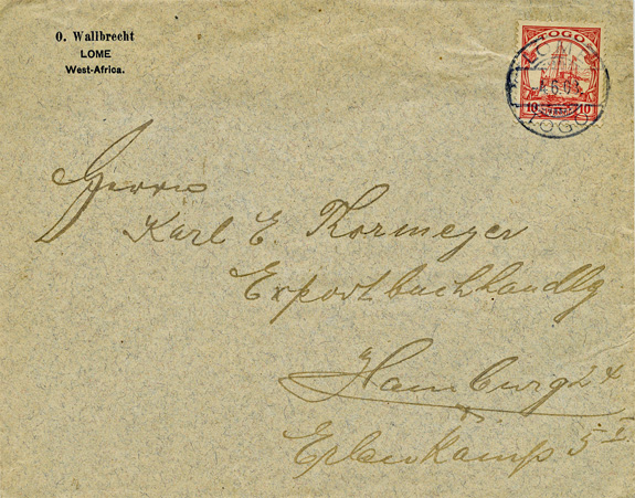 04.06.1908: 10Pf (Mi.9) mit Stempel LOME auf vorgedrucktem Firmenbrief "G.Wallbrecht / Lome / West-Africa" an eine Exportbuchhandlung in Erfurt.