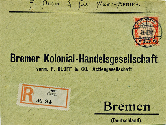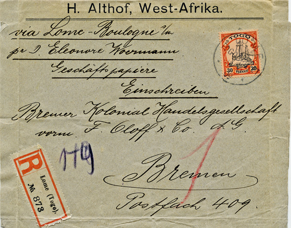 13.10.1909: 30Pf (Mi.12) mit Stempel LOME auf Firmen-R-Brief "H.Althof, West-Afrika" mit R-Zettel "Lome" an die "Bremer Kolonial Handeslsgesellschaft vom F.Oloff & Co" mit Verweis "Geschäftspapiere" sowie Weiterleitungsvermerk "via Lome-Boulogne..per Eleonore Woermann" nach Bremen. Fehlende Briefklappe.