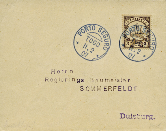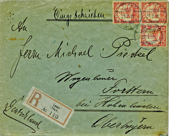23.02.1911: 3x 10Pf (Mi.9) mit 3x Stempel LOME auf Einschreibebrief mit R-Zettel "Lome" an Herrn "Pickel, Wagenbauer" in HOHENLINDEN (18.3.11). Rückseitige Absenderangabe: "B.Winkler Lome Togo West-Afrika". Der Zimmerer Bartholomäus Winkler, zunächst ein Kolonialbeamte in der untersten Dienstgruppe, blieb in Togo nach seinem Ausscheiden aus dem Dienst und eröffnete in Lome eine Schreiner- und Wagenbauerei.