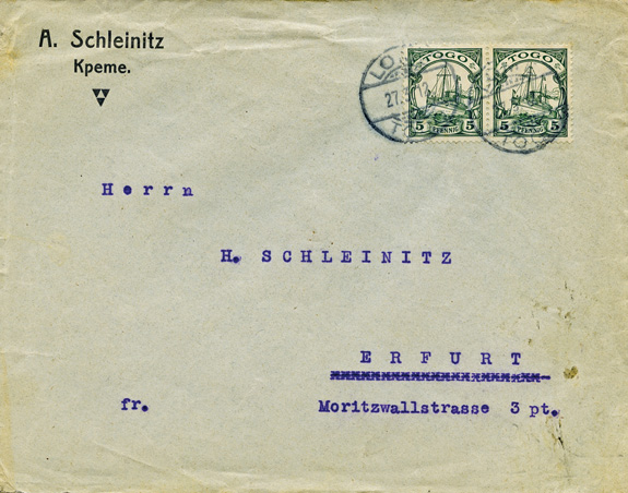 27.03.1912: 2x 5Pf (Mi.8) mit 2x Stempel LOME auf vorgedrucktem Firmenbrief "A. Schleinitz / Kpeme" an Herrn "H.Schleinitz" in Erfurt.