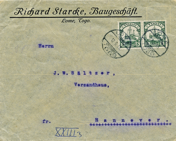 12.05.1913: 2x 5Pf (Mi.8) mit 2x Stempel LOME auf vorgedrucktem Firmenbrief "Richard Starcke, Baugeschäft/ Lome, Togo" an Herrn "J.W.Sätzer, Versandhaus.." in Hannover.