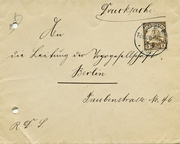 10.09.1904: R.D.S.-Brief als Drucksache mit 3Pf (Mi.7) und Stempel LOME an die "Leitung der Togogesellschaft / Berlin; rückseitig blaue Siegelvignette "KAISERLICHER GOUVERNEUR VON TOGO". Aktenlochung links.