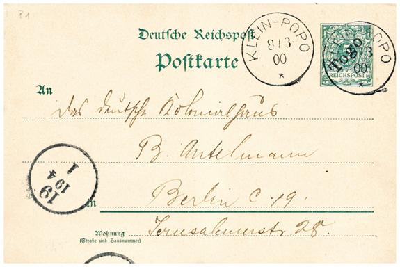 1900/1902, 2 GSK aus Togo: 5Pf Blanko Ganzsachenkarte (Mi.P1) mit 2x Stempel KLEIN-POPO (8.3.00) an das Kolonialhaus Antelmann nach BERLIN. Dazu 10Pf GSK (Mi.P10) mit Stempel LOME (1.12.02) an Julius Jäger in REUTLINGEN (28.12.02).