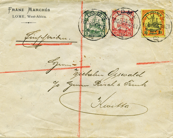 08.01.1902: 3-Farbenfrankatur 5Pf, 10Pf & 25Pf (Mi.8,9,11) mit Stempel LOME auf vorgedrucktem Brief "Franz Marches / Lome / West-Africa" als Einschreiben an "Herrn Wilhelm Osswald c/o Herren Risch & Kunk/ Kwitta" mit rückseitig rotem Lacksiegel & Ankunftsstempel KWITTA 9.1.1902.