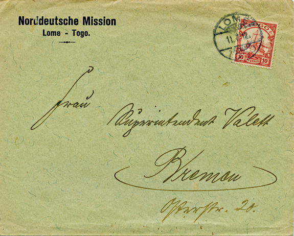 11.07.1912: 10Pf (Mi.9) mit Stempel LOME auf vorgedrucktem Missionarsbrief "Norddeutsche Mission / Lome - Togo" an Frau Valett in Bremen.