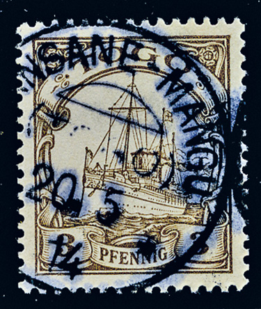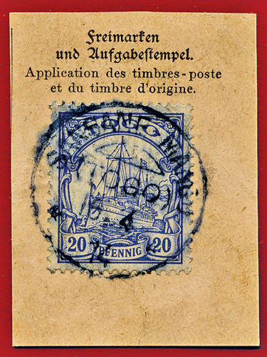 16.04.12: 20Pf (Mi.10) mit dem Stempel SANSANE-MANGU auf Postanweisungsabschnitt; Attest R.Steuer: "Die Marke..zeigt einen vollen Abschlag des sehr seltenen und nur vom 1.3. bis 12.8.1914 verendeten Ortsstempels von Sansane-Mangu mit allen Echtheitsmerkmalen.".