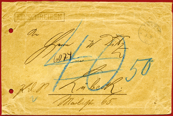 03.09.09: unfrankierter RDS-Umschlag mit Stempel TSEVIE TOGO, sowie Einzeiler-Stempel EINSCHREIBEN mit Kartierungsnummer "6074" nach Lübeck. Da die Versendung nicht anerkannt wurde, wurden handschriftlich in Blau die Taxvermerke "2" und "40" (2.Gewichtstufe & Porto) angebracht und diese nachmals auf die nächst höhere Portostufe "50" erhöht (unfrankierte Briefe konnten nach Anhang II Paragraph 1 der Postordnung vom 20.3.1900 ein Zuschlagsporto von 10Pf erheben). Aktenlochung links und etwas knittrig. Postgeschichtlich hochinteressanter und seltener Beleg.