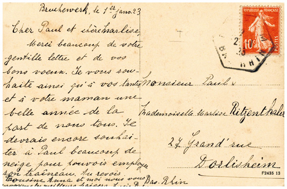 1923: Litho-Ansichtskarte "Konkomba vor dem Häuptlingshaus in Banjeli (Nord-Togo) aus Frankreich (BRUCHEWERK / BAS RHIN, 2.Jan 1923).