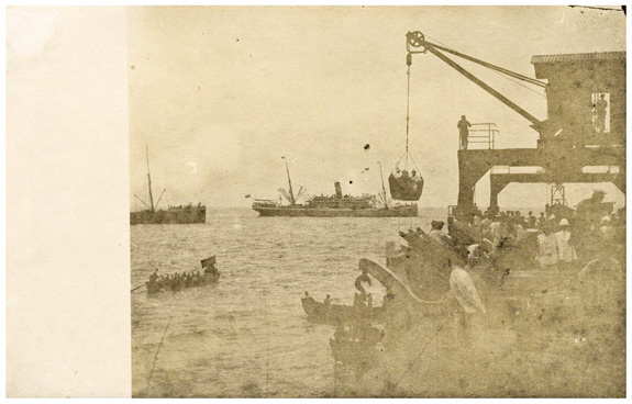 ca. 1905: zwei ungebrauchte Foto-Ansichtskarte mit Abb. von der Aus-/Einschiffung von Passagieren an der Landungsbrücke in Lome mittels Gondel am Dampfkran.