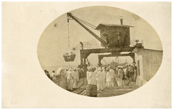 ca.1905: ungebrauchte AK "Togo, Landungsbrücke in Lome" (Ladekran, Bahnwagons)
