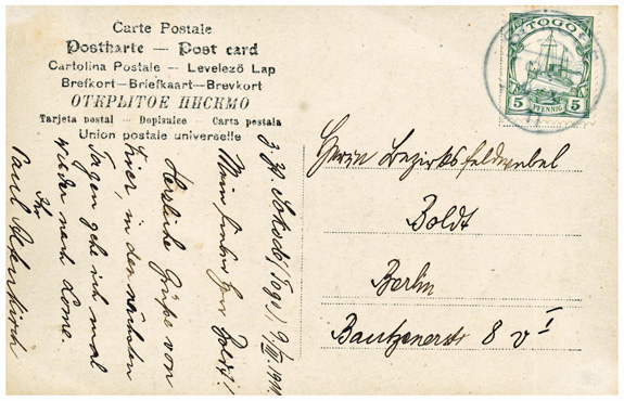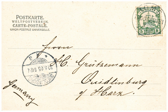 27.09.13: AK "Faktorei der D.T.G. in Nueppe" mit 5Pf (Mi.21) und Stempel LOME nach Spandau.