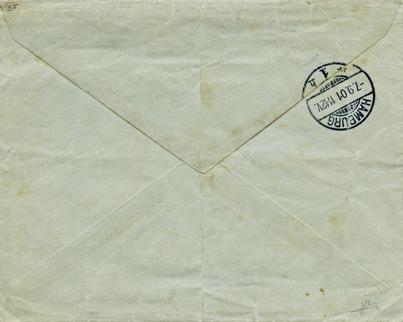 05.08.1901: 10Pf (Mi.9) mit Seepoststempel DSLHW auf vorgedrucktem Firmenbrief "J.FERD. STHAMER, WEST-AFRIKA" an die deutsche Geschätsabteilung der Firma in HAMBURG (07.09.1901).